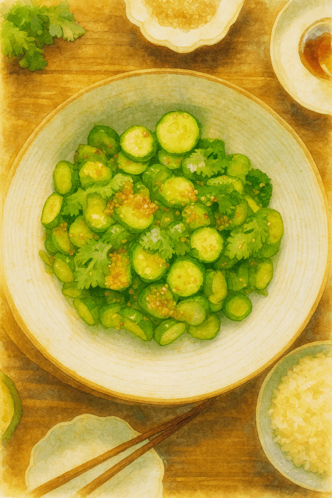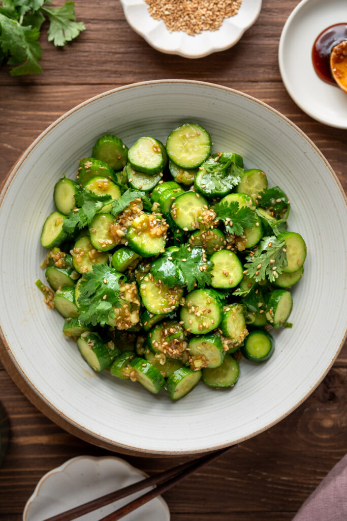 - Add the scallions, cilantro and sauce into the bowl with cucumbers and mix everything thoroughly. Garnish with additional sesame seeds and cilantro and serve immediately.